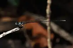 Nososticta koolpinyah is a small, slender damselfly; males are coloured black with greenish blue markings and greenish brown tinted wings, females are black with yellowish markings and clear wings.[6]