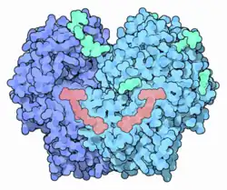 ![]() Structure of glucose oxidase dimer (dark and light blue) complexed with FAD (salmon) and glycans (aquamarine) from Penicillium amagasakiense.[1] | |||||||||