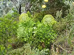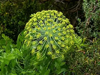 Notobubon galbanum, re-classified from Peucedanum galbanum in 2008,[2] commonly called the blister bush or hog's fennel, is a South African plant that is best known for its ability to cause painful blistering after contact. In Afrikaans this plant species is known as bergseldery (i.e., "mountain celery").[3]