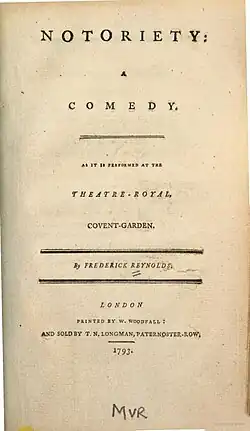 Notoriety is a 1791 comedy play by the British writer Frederick Reynolds. It premiered at the Theatre Royal, Covent Garden on in London on 5 November 1791.[1][2] The original cast included William Thomas Lewis as Nominal, John Quick as Colonel Hubbub, Richard Wilson as Sir Andrew Acid, Joseph Shepherd Munden as Lord Jargon, William Farren as Clairville, Charles Farley as James, John Henry Johnstone as O'Whack, Mrs Webb as Lady Acid, Mary Wells as Sophia Strangways and Harriet Pye Esten as Honoria.