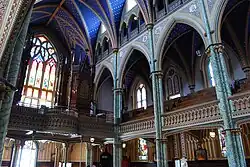 The interior of the church is brightly painted and decorated with carved features, exquisite stained glass windows and hundreds of statues of various religious figures. Louis-Philippe Hébert completed thirty large wooden sculptures in the choir. At the end of the choir, the Holy Family is completed with saints John the Baptist and Patrick, the patron saints of French and Irish Catholics.[12]