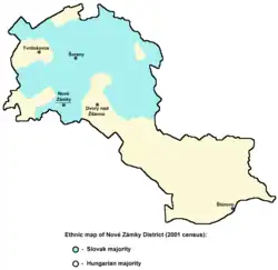 Nové Zámky District (okres Nové Zámky) is a district in the Nitra Region of western Slovakia. Until 1918, the area of the district was split between several counties of the Kingdom of Hungary: the largest area in the north formed part of Nitra; an area in the south between Dvory nad Žitavou and Strekov formed part of Komárno; an area in the north-east around Veľké Lovce formed part of Tekov; a sizable area in the east formed part of Esztergom (Ostrihom); and a small area around Salka formed part of Hont County.
