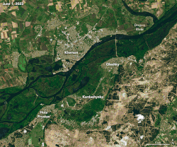Before the breach, the Kakhovka Reservoir was 5–20 km (3.1–12.4 mi) wide, and quite difficult for an army to cross. As of 20 June, satellite images show that it has reverted to a river 500–1,000 m (1,600–3,300 ft) wide with the flood plain on either side rapidly drying out.[161][162] In some places it seems that it could be possible to cross the Dnieper River in a 4WD.[163] It has been asserted that the Ukrainian military could take advantage of this, and of the fact that the Russians have moved troops from that area to buttress their forces in Zaporizhzhia and the Donbas, to cross the Dnieper by assault.[163] In addition, the Ukrainians control the dams and reservoirs on the Dnieper upstream from Kakhovka, and could choose to hold more water there to dry up the river downstream and make it easier to cross.[164]