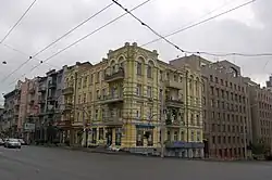 With the opening of the railway in Kyiv in 1870, tram lines through the Velyka Vasylkivska Street (1897), number of factories in Demiivka and socially significant buildings, including 4th Men Gymnasium (1899), Troitsky People's House (now Kyiv Theatre of Operetta; 1901) and St. Nicholas Catholic Church (1893-1909) along the main streets of the neighbourhood, the area became popular with real estate developers. At the turn of the century, the area became dominated by revenue houses — four and five-story buildings with the first floors occupied by shops and the rest by long-term rental apartments.[3]