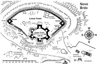 Novo Brdo Fortress consists of two parts:[5] the Upper Town and the Lower Town. It is composed of eight rectangular towers (six in the Upper Town and two in the Lower Town), three gates (one in the Upper Town and two in the Lower Town), and a large dry moat around most of the walls (from the north point of Upper Town to the north point of Lower Town to the south point of Lower Town). Upper Town has an irregular hexagonal shape. Lower Town fans out toward the west down the slope of the hill. The dry moat wraps around the fortress from the west to the north. There is a source of drinking water inside the fortress. Vast suburbs (Serbian: Подграђе) outside the city walls expand to the east and southeast. Settlements of Sass miners and merchant colonies of traders from Dubrovnik were located in the suburbs, as well as merchants from the Italian city-states, especially Venice.
