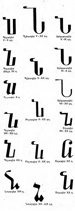 Nu, or Now (majuscule: Ն; minuscule: ն; Armenian: նու) is the 22nd letter in the Armenian alphabet. It is pronounced as the voiced alveolar nasal /n/ or the voiced velar nasal /ŋ/ before a velar consonant.[1] It is typically romanized with the letter N.[2] Created by Mesrop Mashtots in the 5th century, it can also represent the number 400 in the Armenian number system.[3]