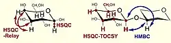 | 1H,13C HSQC Relay | Implicit carbon-carbon correlation via vicinal couplings of the attached protons | assignment of neighboring carbon atoms |