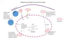 More NUMT sequences of different sizes and lengths in the diverse number of eukaryotes have been detected as whole genome sequencing of different organisms accumulates.[4] They have often been unintentionally discovered by researchers who were looking for mitochondrial DNA (mtDNA).[5] NUMTs have been reported in all studied eukaryotes, and nearly all mitochondrial genome regions can be integrated into the nuclear genome.[6][7] However, NUMTs differ in number and size across different species.[6][8][9] Such differences may be accounted for by interspecific variation in such factors as germline stability and mitochondria number.[10] After the release of the mtDNA into the cytoplasm, due to the mitochondrial alteration and morphological changes, it is transferred into the nucleus[1][5] and inserted by double-stranded break repair processes into the nuclear DNA (nDNA).[1] A correlation has been found between the fraction of noncoding DNA and NUMT abundance in the genome,[10][11][12] and NUMTs are observed to have non-random distribution and a higher likelihood of being inserted in certain genomic regions.[12] Depending on the location of the insertion, NUMTs might disrupt gene function.[1] In addition, de novo integration of NUMT pseudogenes into the nuclear genome can have adverse effects.[13][14][15][16]