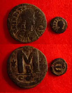 The term nummus is now usually applied solely to the 5th–7th century Byzantine issues. These were small, badly struck coins, weighing less than 1 gram, forming the lowest denomination of Byzantine coinage. They were valued officially at 1⁄7,200 of the gold solidus but more usually rated to 1⁄6,000 or 1⁄12,000.[5] The nummus usually featured the profile of the reigning Byzantine emperor on the obverse and the Byzantine imperial monogram on the reverse, although some coins of Emperor Justinian I (r. 527–565) display its numerical value by the Greek numeral "A" instead.[5]