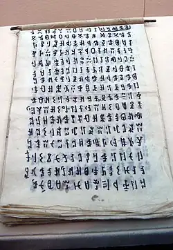 The Modern Yi script (ꆈꌠꁱꂷ nuosu bburma [nɔ̄sū bʙ̝̄mā] 'Nosu script') is a standardized syllabary derived from the classic script in 1974. It was made the official script of the Yi languages in 1980. There are 756 basic glyphs based on the Liangshan dialect, plus 63 for syllables only found in Chinese borrowings. The government requires the use of the script for signs in some designated public places.[12]