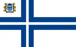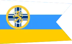 The club was founded on March 4, 1861, with the approval of its constitution by Tsar Alexander II. His brother, Admiral-General Grand Duke Konstantin, officiated at the inauguration ceremony. In the same year, NJK received its first yachting ensign, based on the flag of the Neva Yacht Club of St. Petersburg: white with a blue cross (similar to the flag of Finland), with the crest of the district of Nyland (Uusimaa) in the upper inner corner.[1] Today's flag, introduced in 1919, is the fourth version of the original. The official language of the club is Swedish.