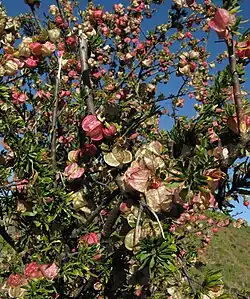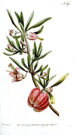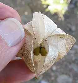 Nymania capensis is a species of plant known in English as "Chinese lantern" because of the shape of its bright, colourful fruit, and in Afrikaans as "klapper" (meaning "firecracker" because children sometimes pop the capsules for fun).[1] It is the only species in the genus Nymania. It is a spare, scrubby, woody shrub or small tree, typically ) 0.5–3 m tall. It is endemic to South Africa and some closely bordering territories, especially inland regions in central, northern and eastern parts. It grows mainly in Karooid regions, among the scrub of gorges, but also in open veld and river banks in the Great and Little Karoo, Namaqualand and Kalahari.[2] The leaves are alternate and fascicled. They are simple and more or less linear. The flowers are solitary, born on pedicels in axils. The corolla and calyx have four lobes each, with eight stamens inserted at the base of the disc, the filaments being connate at their base. The ovary is superior and sessile; it has four lobes and four locules, each containing two collateral ascending ovules. The stigma is simple and the style extends further than the stamens. The fruit is an inflated membranous capsule, 3–5 cm across, each locule forming a distinct lobe. The ripe seeds are hard and rounded, some 2–4 mm in diameter. A locule may contain less than two seeds, due to abortion.[3]