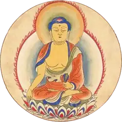 Buddhas in Japan are called Nyorai and they occupy the top of the four ranks of the Japanese Buddhist pantheon, called Nyorai-bu (如来部), literally "Nyorai category". The Nyorai-bu is followed in order by the Bosatsu-bu (bodhisattva), Myōō-bu (Wisdom Kings), and ten-bu (Deva). The most important Nyorai of the Japanese Buddhist pantheon (apart from the historical Buddha, Shaka Nyorai) are Amida Nyorai (Amitābha), Dainichi (or Birushanabutsu) Nyorai (Vairocana), and Yakushi Nyorai (Bhaisajyaguru).[5] Other common Nyorai are Ashuku Nyorai (Akshobhya), Fukūjōju Nyorai (Amoghasiddhi), Hōshō Nyorai (Ratnasambhava), Miroku Nyorai (Maitreya), and Tahō Nyorai (Prabhutaratna). Although this category includes only Indian deities, because of the honji suijaku theory some were believed to have ties with Japanese kami. Amaterasu for example was considered another appearance of Dainichi Nyorai.[6]
