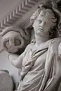 Following the 5th century BC, depictions of Nyx no longer show her alongside other celestial deities, and most representations are uncertain.[172] She has been identified as one of the deities fighting against the Giants on the Gigantomachy frieze of the Pergamon Altar (2nd century BC), where she is shown grabbing the edge of a shield belonging to bearded giant, and in her other hand holds a jar with a snake wrapped around it.[173] In later depictions, Nyx is often portrayed as a velificans (with a veil billowing behind her head), and on Roman sarcophagi is a figure who puts others to sleep.[174]