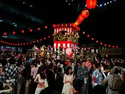 The "Obon season" continues to play an important part of the present-day culture and life of Hawaii and are held among the five major islands on weekend evenings from June to August. They are held usually at Buddhist missions, but sometimes at Shinto missions or at shopping centres.[34][35] At some Buddhist missions, the dance is preceded by a simple ritual where the families of the deceased in the past year burn incense for remembrance, but otherwise the event is non-sectarian. The songs played differ among the regions, however typically starts with Tankō Bushi from Kyushu, continues with songs such as Kawachi Otoko Bushi, Yukata Odori, Asatoya Yunta and Ashibina from Okinawa Prefecture, and modern dances such as the Baseball Ondo and Pokémon Ondo for children, and typically ends with Fukushima Ondo, celebrating abundant harvest.[36] The participants, Japanese descendants and the people of all races, dance in a big circle around the yagura, the central tower set up for the dance, from which recorded songs are broadcast. As on the mainland, bon dance lessons are given by volunteers in larger cities before the actual events.[37][38]
