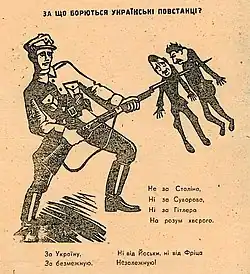 The goal of the OUN was to establish an independent Ukrainian state. This goal, according to the OUN founding declaration, "was to be achieved by a national revolution led by a dictatorship" that would drive out occupying powers and then establish a "government representing all regions and social groups"; OUN accepted violence as a political tool against enemies of their cause.[13][14] In order to achieve this goal, a number of partisan units were formed, merged into a single structure in the form of the UPA, which was created on 14 October 1942. From February 1943, the organization fought against the Germans in Volhynia and Polesia.[15] At the same time, its forces fought against the Polish resistance,[16] during which the UPA carried out massacres of Poles in Volhynia and Eastern Galicia,[17] resulting in the deaths of an estimated 60,000 to 120,000 Polish civilians.[18][19][20][21] In 1944, as the German army was retreating, the UPA started to attack its rear and seize the equipment. At the end of July 1944, the UPA aligned itself with Nazi Germany, ceasing its attacks on Wehrmacht positions and attacking the Soviets in exchange for military aid.[22] Soviet NKVD units fought against the UPA, which led armed resistance against Soviets until 1949. On the territory of Communist Poland, the UPA tried to prevent the forced deportation of Ukrainians from western Galicia to the Soviet Union until 1947.[16]
