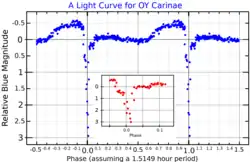 ![]() A blue band light curve for OY Carinae, adapted from Khruzina1 et al. (2003).[1] The main plot shows the full light curve, and the inset shows the minimum with an expanded horizontal scale. | |