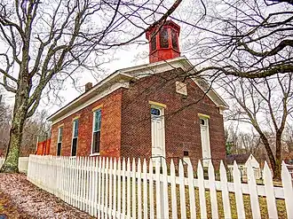 The church building is a brick structure with a tin roof and foundation of sandstone. Its primary builders, Isaac Parry and Thomas Herbert, produced a Greek Revival structure;[3] although just one story tall, it features a bell tower atop the roof. The building as a whole is a simple rectangle, although the bell tower is octagonal.[2]