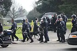 As of 2015 the department has lost 52 officers killed in the line of duty, 33 of whom died as a result of gunfire.[27] The 2009 shootings of Oakland police officers took place on Saturday, March 21, 2009, when four Oakland, California police officers were killed by a felon wanted on a no-bail warrant for forcible rape of a minor as well as a parole violation. The suspect shot and killed Traffic Division Sgt. Mark Dunakin and Officer John Hege when they stopped him for a traffic violation. They were unaware he was armed and wanted, and he drew a handgun and shot both officers before they could react. He fled to a nearby apartment and staged an ambush of the police SWAT team as they attempted to arrest him, killing officers Ervin Romans and Daniel Sakai before he too was killed by police gunfire.[28]