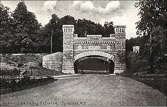 Oakwood Cemetery is a 160-acre (65 ha) historic cemetery located in Syracuse, New York. It was designed by Howard Daniels and built in 1859. Oakwood Cemetery was created during a time period in the nineteenth century when the rural cemetery was becoming a distinct landscape type, and is a good example of this kind of landscape architecture.[2]