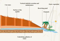 Oases develop in "hydrologically favored" locations that have attributes such as a high water table, seasonal lakes, or blockaded wadis.[4] Oases are made when sources of freshwater, such as springs, underground rivers, or aquifers irrigate the surface naturally or via man-made wells.[5] The presence of water on the surface or underground is necessary and the local or regional management of this essential resource is strategic, but not sufficient to create such areas: continuous human work and know-how (a technical and social culture) are essential to maintain such ecosystems.[6][7] Some of the possible human contributions to maintaining an oasis include digging and maintaining wells, digging and maintaining canals, and continuously removing opportunistic plants that threaten to gorge themselves on water and fertility needed to maintain human and animal food supplies.[8] Stereotypically, an oasis has a "central pool of open water surrounded by a ring of water-dependent shrubs and trees…which are in turn encircled by an outlying transition zone to desert plants."[9]