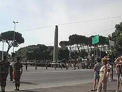 The Italian occupation of Ethiopia ended in 1937 with looting, in which King Ezana's obelisk of Axum was taken to Italy as war spoil. The monolith was cut into three pieces and transported by truck along the tortuous route between Axum and the port of Massawa, taking five trips over a period of two months. It travelled by the ship, Adwa, arriving in Naples on March 27, 1937. It was then transported to Rome, where it was restored, reassembled and erected on Porta Capena square in front of the Ministry for Italian Africa. This square would later become the headquarters of the United Nations's Food and Agriculture Organization and the Circus Maximus. The obelisk was officially unveiled on October 28, 1937 to commemorate the fifteenth anniversary of the March on Rome.[12] The operation was coordinated by Ugo Monneret de Villard.
