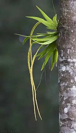 Oberonia, commonly known as fairy orchids,[2] is a genus of flowering plants in the family Orchidaceae. Orchids in this genus are epiphytic or lithophytic plants with the leaves arranged fan-like, overlapping at the base and spreading near the tips. Large numbers of tiny, short-lived, cup-shaped, non-resupinate flowers are arranged on an arching flowering stem that emerges from the base of the uppermost leaf. There are about 270 species occurring from tropical and southern Africa to the Pacific.[3]
