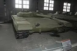 The tank had an extremely low profile, with a crew of two which sat in an isolated compartment in the turret. The main armament was a 125 mm rifled missile launcher, with a maximum range of 4 km for the "Rubin" anti-tank guided missiles, and 9 km for the "Bur" surface-to-surface missiles. It had a rate of fire of 4-5 rounds/min for the "Rubin", and 8-10 rounds/min for the "Bur". Both munitions were guided by an infra-red beam. The "Rubin" anti-tank missiles were capable of penetrating 250 mm of armor at 60° at a range of 4 km. The tank also featured a hydropneumatic suspension and built-in dozer blade, both of which were uncommon for the time.
