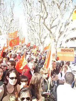 The Occitan cross (Occitan: crotz occitana [ˈkɾuts utsiˈtanɔ] ⓘ), also called cross of Occitania (crotz d'Occitània), cross of Languedoc (crotz de Lengadòc) or cross of Toulouse (crotz de Tolosa),[a] heraldically "cross cleché, pommettée and voided", is a heraldic cross, today chiefly used as a symbol of Occitania. In the Chanson de la Croisade Albigeoise, it goes by the name of "Raymondine cross" (crotz ramondenca or ramondina).[2]