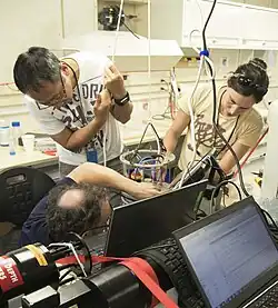 Scientists study individual tiny objects such as plankton and detritus particles using flow cytometry and in situ camera systems. Flow cytometers measure sizes and take photographs of individual particles flowing through a tube system; one such instrument is the Imaging FlowCytoBot (IFCB).[26] In situ camera systems are deployed over the side of a research vessel, alone or attached to other equipment, and they capture photographs of the water itself to image the particles present in the water; one such instrument is the Underwater Vision Profiler (UVP).[27] Other imaging technologies used in the ocean include holography[28] and particle imaging velocimetry (PIV), which uses 3D video footage to track the movement of underwater particles.[29]