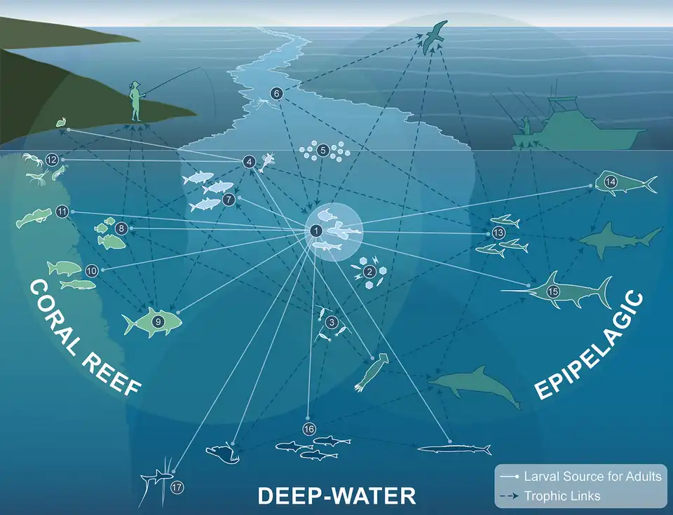 The diagram shows: (1) Larval and juvenile stages of fishes from many ocean habitats aggregate in slicks in order to capitalize on dense concentrations of prey (2, phytoplankton, 3, zooplankton, 4, larval invertebrates, 5, eggs, and 6, insects). The increased predator–prey overlap in slicks increases energy flow that propagates up the food-web (dotted blue lines show trophic links), enhancing energy available to higher trophic level predators (icons outlined in blue) including humans. More than 100 species of fishes develop and grow in surface slick nurseries before transitioning to adults (solid white lines radiating outward) in Coral Reefs (7–12), Epipelagic (13–15), and Deep-water (16–17) ocean habitats. As adults these taxa (icons outlined in white) play important ecological functions and provide fisheries resources to local human populations. For example, coastal schooling fishes (7, mackerel scad) are important food and bait fish for humans. Planktivorous fish (8, some damselfishes and triggerfishes) transfer energy from zooplankton up to reef predators like jacks (9),[101] which provide top-down control of reefs [102] and are important targets for shoreline recreational fisherfolk.[103] Grazers (10, chubs) help keep coral reefs from being overgrown by macroalgae.[104] Cryptobenthic fishes such as blennies (11) and benthic macrocrustaceans (12, shrimp, stomatopods, crabs) comprise most of the consumed biomass on reefs.[105][106] In the pelagic ocean, flyingfishes (13) channel energy and nutrients from zooplankton to pelagic predators such as mahi-mahi (14) and billfish (15), both of which utilize slicks as nursery habitat. Larvae of mesopelagic fishes like lanternfish (16) and bathydemersal tripod fishes (17) utilize these surface hotspots before descending to deep-water adult habitat.[96]