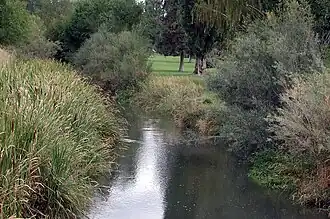 Flowing west from the lower end of the lake at about RM 9 (RK 14), the creek runs through the Prineville Golf and Country Club, passes under Highway 26 and enters Prineville and Ochoco Creek Park north of the highway at about RM 4 (RK 6). Turning northwest out of Prineville, the stream soon passes under Highway 26 again and enters the Crooked River roughly 47 miles (76 km) from its confluence with the Deschutes River, a tributary of the Columbia River.[4][5]