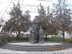 In the park there are sculptural compositions: the "Bench of Reconciliation" and the Monument to Peter and Fevronia; there is also the Memorial Plaque dedicated to the soldiers and officers of the 56th Army and the Alley of Glory. Another notable place of the October Revolution Park is an artificial lake, where one can see waterfowl, as well as aviary for flamingos and peacocks.[2][3]