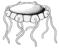 Octomedusa possess 7-8 tentacles that each come from a pentagonal bell. Every tentacle is equal in length however they may vary but never exceed the diameter of the cnidarian body. A narrow velum (velarium) is present in the organism and is 1 millimeter (0.039 in)-1 millimeter (0.039 in) in width. The large manubrium, represented by a square-central impression about 1 millimeter (0.039 in), contains a cruciform mouth.[1] A smooth and scalloped margin are present in specimens, however they were proven to be the result of artefacts made from preservation.[6] Each tentacle has a length of 4 millimeters (0.16 in)-10 millimeters (0.39 in). The preserved remains of the organism are so general that they were originally not able to be assigned to either the true jellyfish or the hydroids.[1]