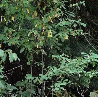 Oemleria cerasiformis, a shrub commonly known as osoberry,[7] squaw plum,[8] Indian plum,[9] or Indian peach,[10] is the sole extant species in the genus Oemleria.[11] The deciduous and perennial shrub can grow up to 7 meters tall, with spreading branches that produce small white flowers and bitter fruit that only become sweet when fully ripe. Osoberry is dioecious, only female plants producing fruit, while males produce a high reproductive biomass of pollen and flowers. The flowers are insect and hummingbird-pollinated and the fruits are consumed by both birds and mammals, which later disperse the seeds in their droppings (endozoochory).