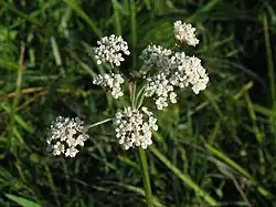 It flowers between June and September in northern Europe, with umbels of 5-9 smaller umbels about 1-2 cm in diameter, each of which has numerous white flowers. There are about 5 awl-shaped bracts on the main umbel and 5-7 small bracteoles at the base of each of the individual umbellules. Plants are monoecious, with hermaphroditic and male flowers in all umbels, but the proportion of hermaphroditic flowers decreases as the season progresses. Each flower has 5 unequal petals with the larger, outer ones slightly larger, 5 stamens and 2 prominent styles arising from a swollen base (stylopodium) at the top of the ovary. After flowering, the flower stalks do not expand (as they do in some other species of water-dropwort) and the umbels do not become flat-topped.[1][3]