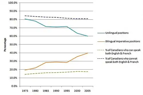 Positions in the public service are classified in four ways, depending on the required linguistic capacity of the candidate for the position: bilingual imperative, English essential, French essential or either French or English essential. The bilingual imperative category is further broken down into the level of both languages the candidate is required to speak. Since 1989 there has been a sharp increase in the number of positions classified as ‘bilingual imperative’ and a sharp decrease in the number of positions open to unilingual Canadians.