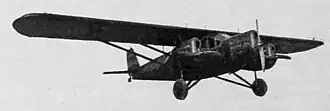 The trimotor Osprey was a monoplane with a high, three-part wing of rectangular plan out to blunted tips. Its centre section contained two 45 US gal (37 imp gal; 170 L) fuel tanks and extended as far as the outer engines. The trailing edges of the outer panels were filled with narrow chord ailerons. The wing was built around twin spruce box spars with spruce ribs and was fabric covered, though its leading edges were spruce plywood. The outer panels were braced from the lower fuselage longerons by parallel pairs of struts to the spars which ran through the outer engine mountings. The engines were further braced with central struts to the upper longerons.[1][2]