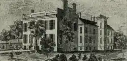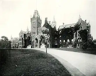 The campus was designed to be visually appealing, originally with an entrance gate, a broad shaded avenue toward the campus buildings, and an expansive park with large old trees.[6] The original main building was large, with two wings symmetrically to the north and south of the center. The central section was asymmetrically-massed. The building had numerous decorative elements, including lancet arched doorways and windows, stone-topped buttresses, turrets, and gables. The original roof was removed and replaced with a simplified version in the late 20th century.[4]