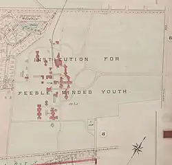 In 1871, the school's name was adjusted to the Ohio Institution for the Education of Idiotic and Imbecile Youth. The campus was built upon gradually, with wings added to the main building in 1876 and 1878, with a heating plant, laundry, workshop, coal house, and hospital also constructed around this time. Construction labor was predominantly sourced from the institute's adult patients. In 1881, the school was renamed the Ohio Institution for Feeble-Minded Youth.[7]: 8–10 At this time, the institute had 614 students.[6] Also in this year, on November 18, the main building was destroyed in a fire, several side wings were severely damaged, and about 20 years of records were lost.[7]: 8–10 A safe evacuation took place, and within three years the buildings had been reconstructed.[6] From 1888 to 1890, buildings were constructed for dining rooms, shops, and kitchens. Another fire damaged the main building in 1895, destroying most of the south wing. The structure was rebuilt and occupied by May 1895.[7]: 11