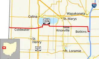 State Route 219 (SR 219) is an east–west state highway in the western portion of the U.S. state of Ohio. State Route 219's western terminus is at the Indiana State Line approximately 5.5 miles (8.9 km) northwest of Fort Recovery, with the roadway continuing west into the Hoosier State being County Road 300N. The eastern terminus of State Route 219 is at a diamond interchange with Interstate 75 at its Exit 104 in Botkins.
