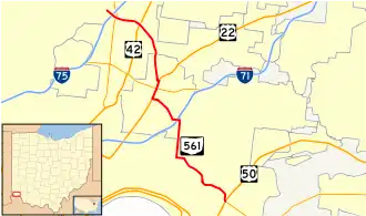 SR 561 heads north from the southern terminus at an interchange with US 50. The route heads northwest turning north towards Interstate 71. After I–71, the road has a short concurrency with US 22/SR 3 in Norwood. The road heads towards the northern terminus at Vine Street, passing through a traffic light at SR 4 (Paddock Road) just south of exit 9 of I–75.[4]