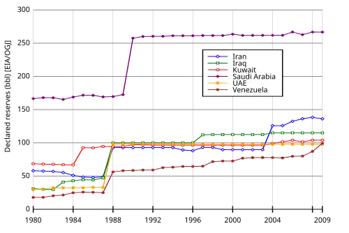 Another contributing factor for the steady P/R-ratio is the large expansion of OPEC reserves, that were booked in the years around 1988. The OPEC quota system had been amended, allowing a production which relates to the reported reserves. Within a few years, OPEC members raised their reserves on paper without reporting any major new discoveries.[7]
