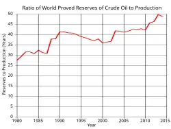 The so-called crude oil constant refers to the approximately constant estimate of available petroleum reserves to production ratio R/P. The estimated duration until the available petroleum reserves are depleted at current production has remained around 40 years since the late 80s.[2]: 15 Prewar and immediately postwar estimates were sometimes lower, in 1919 as low as 9 years (USA) and in 1948 around 20 years (world) and rose up to 35 years until the 1970s.[3] However, since then the duration value of static production T=R/P has been rather constant for decades despite rising oil consumption.