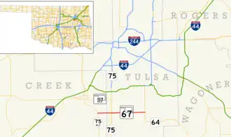 State Highway 67, abbreviated as SH-67, is a 9.94-mile-long (16.00 km) highway on the south side of Tulsa. It begins in the west at U.S. Route 75 Alternate in Kiefer and runs east along 151st St. South before ending at US-64 in Bixby. Along the way it crosses US-75 in Glenpool. It has no lettered spur routes.