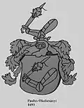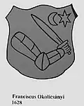 Unlike the coat of arms of Bernard (1512) and Ján (1541)[30] The "quartered" coat of arms of the Bratislava and Varadín bishop Ján Okolicsányi († 1736) from 1726 is the most visually striking version of the coat of arms using a crescent and a star - in combination with an arm with a sabre and a severed head. In the first and fourth fields it depicts a crescent and a star, and in the second and third fields an arm with a sabre and a severed head. Pavol Okolicsányi also used a similar coat of arms, but with the order of the fields reversed (with an arm with a sabre and a severed head in the first and fourth fields and a crescent and a star in the second and third fields).[31]
