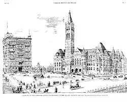Planners proposed a public plaza at the south entrance of the city hall called Victoria Square. The space was to be an urban square with diagonal walkways meeting at a central statue of Queen Victoria, its proposed namesake.[9] The plan was never executed and a smaller space was allocated in front of the building by Queen Street. The City Beautiful movement influenced Toronto planning as well in the early 20th century, and a plan was formulated for a grand thoroughfare from Queen Street at City Hall to Front Street that would have been called Federal Avenue.[10] It, too, was never built, though the City Beautiful movement did influence the urban design principles of nearby University Avenue.