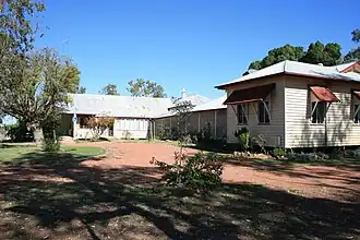 On 14 September 1970, the Queensland Cabinet decided that Isisford Hospital in future would operate as an Outpatients' Centre with a number of holding beds and a dental clinic.[48] The facilities on the hospital site at this time were: a general section with a private ward (one bed), male public ward (four beds), female public ward (4 beds); a maternity section with a public ward (two beds), two private rooms and a labour ward; outpatient department; operating theatre block; Xray department; dental clinic; kitchen and dining room block; laundry block; boiler house; morgue; storerooms; nursing staff quarters in the quarters provided for the medical superintendent; and male staff quarters in the kitchen/dining room block. The public ward and nursery in the maternity ward was used by the Matron as a bedroom and sitting room, and the private rooms had been converted to a Dental Clinic because maternity cases were transferred to the Blackall Hospital. Later, the medical superintendent's residence was removed.[1]