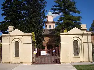While the construction of the main hospital building was underway, the convict labourers also undertook the construction of the brick wall that surrounds the complex, that has survived largely intact. By 1829, convict bricklayers and stonemasons had built a 10-foot high wall, with stone entrance pillars, that was to remain, almost in its entirety, as a historical boundary for the site. This wall has limited the physical expansion of the site throughout its history and ensured that, while the site did not expand, the buildings and the land had a continual history of adaption, modification and reuse.[3][1]