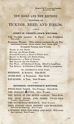 Hawthorne was ending his brief stay in Lenox, Massachusetts, as The Snow-Image, and Other Twice Told Tales was being prepared. During his time there, Hawthorne had befriended Herman Melville, who had just published Moby-Dick with a dedication to Hawthorne as Hawthorne was preparing the preface for his new book.[3] Publisher James T. Fields compiled the collection of 15 tales and sketches and published it in book form in December 1851. Commercially, it was Hawthorne's least popular book.[4]